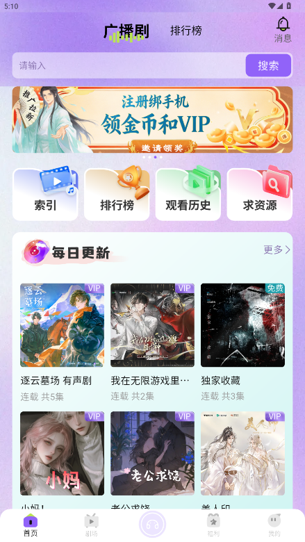 1.打开潮生 FM,在首页浏览推荐的听书、广播剧内容。