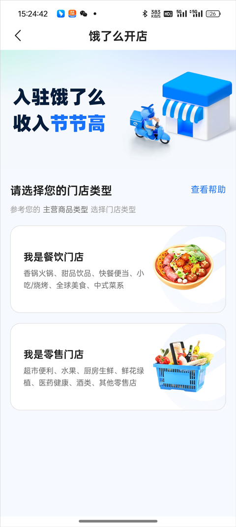 2、随后根据自己的经营类别,选择“餐饮门店”或“零售门店”两种类型之一。