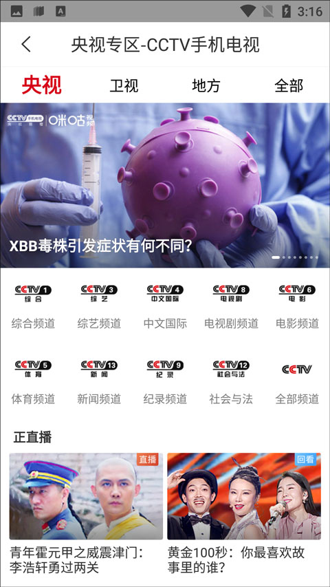 1、打开软件,在首页可以看到拥有央视专区这个选项