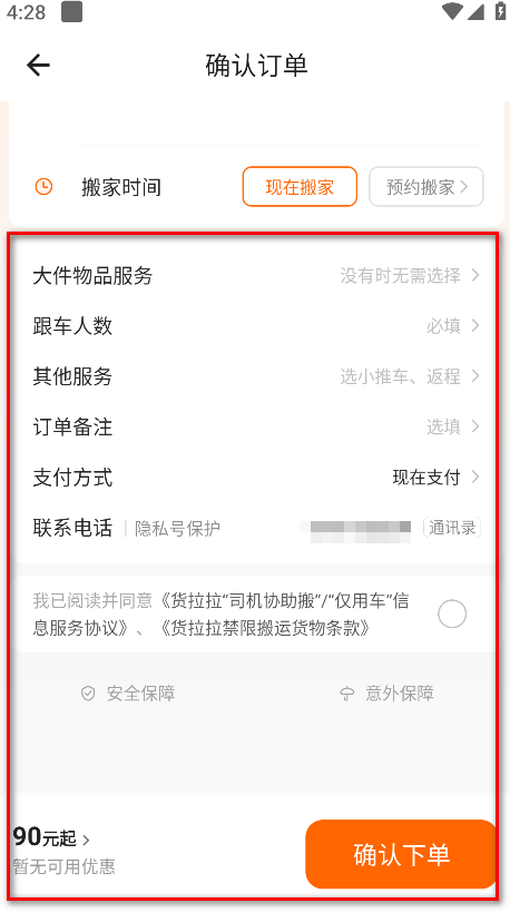 4.填写订单相关的信息,然后勾选我已阅读并同意《货拉拉“司机协助搬"/“仅用车”信息服务协议》.《货拉拉禁限搬运货物条款》,点击确认下单即可。