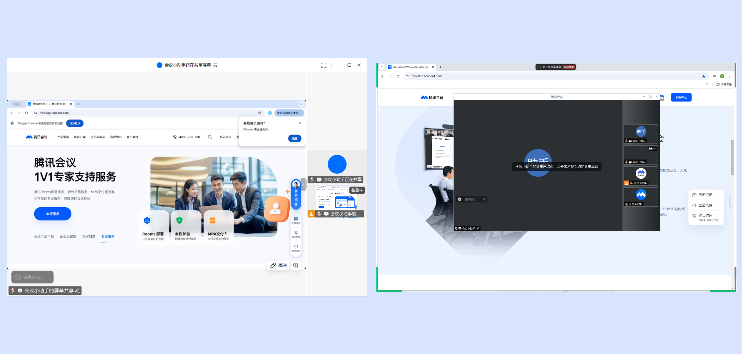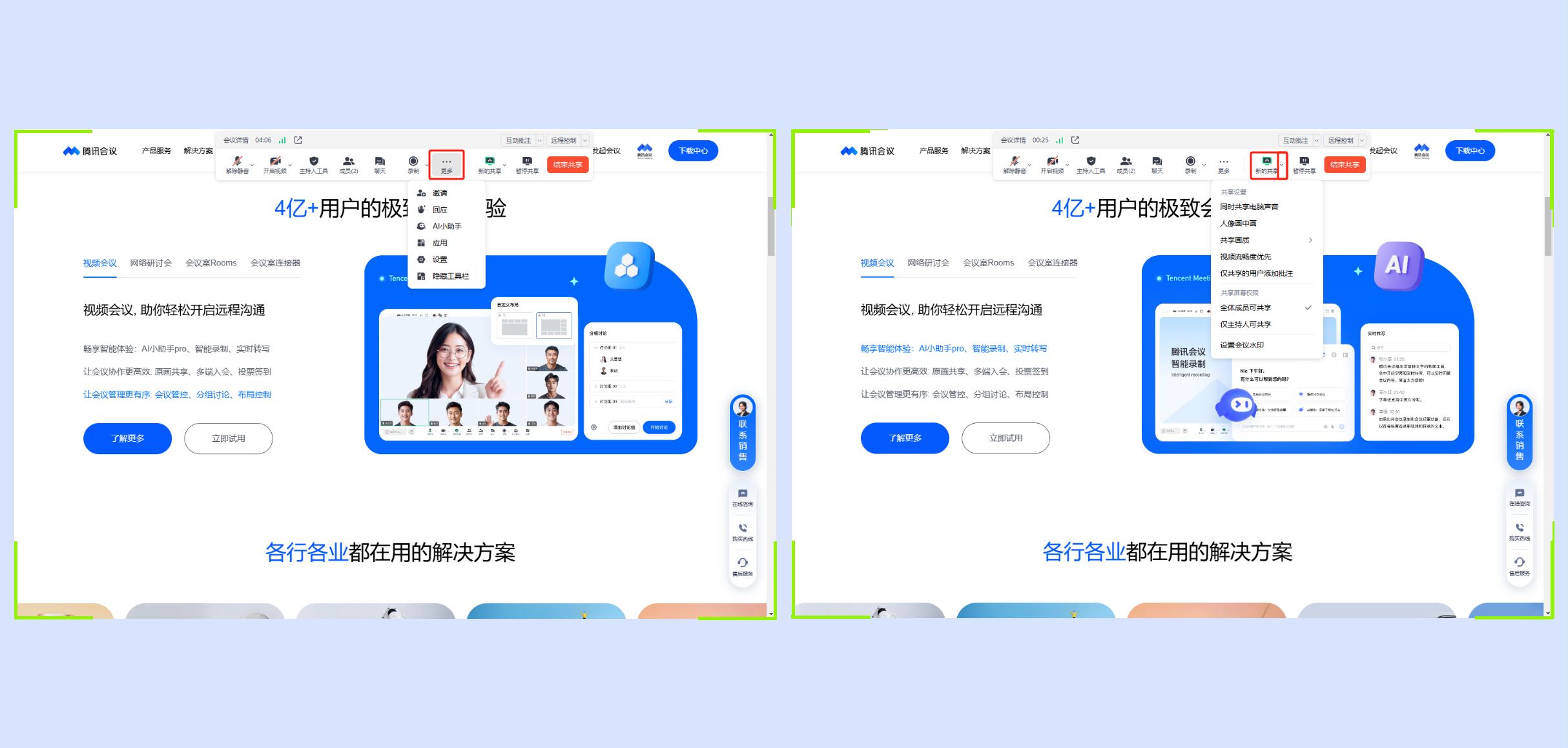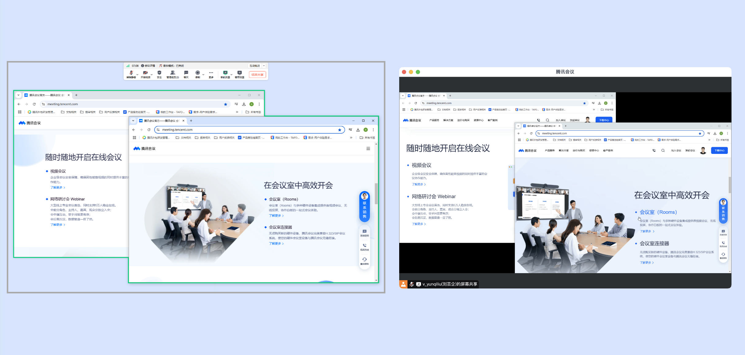 注:桌面端参会用户可共享和观看同时共享多应用窗口内容;移动端参会的用户仅支持观看。