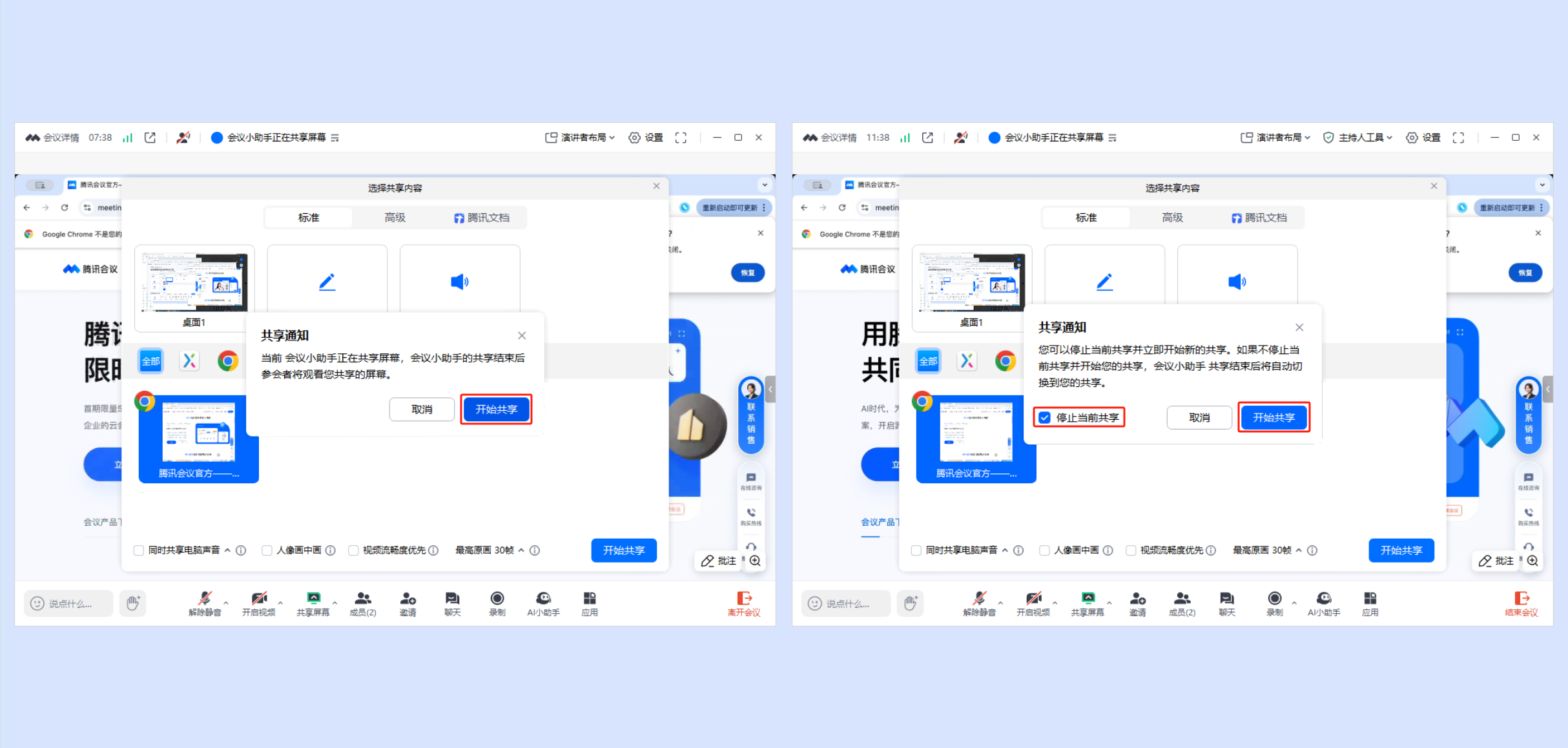 ①新的共享:可以重新选择共享内容。点击【确认共享】后,会关闭当前的共享画面,将新的内容进行共享。