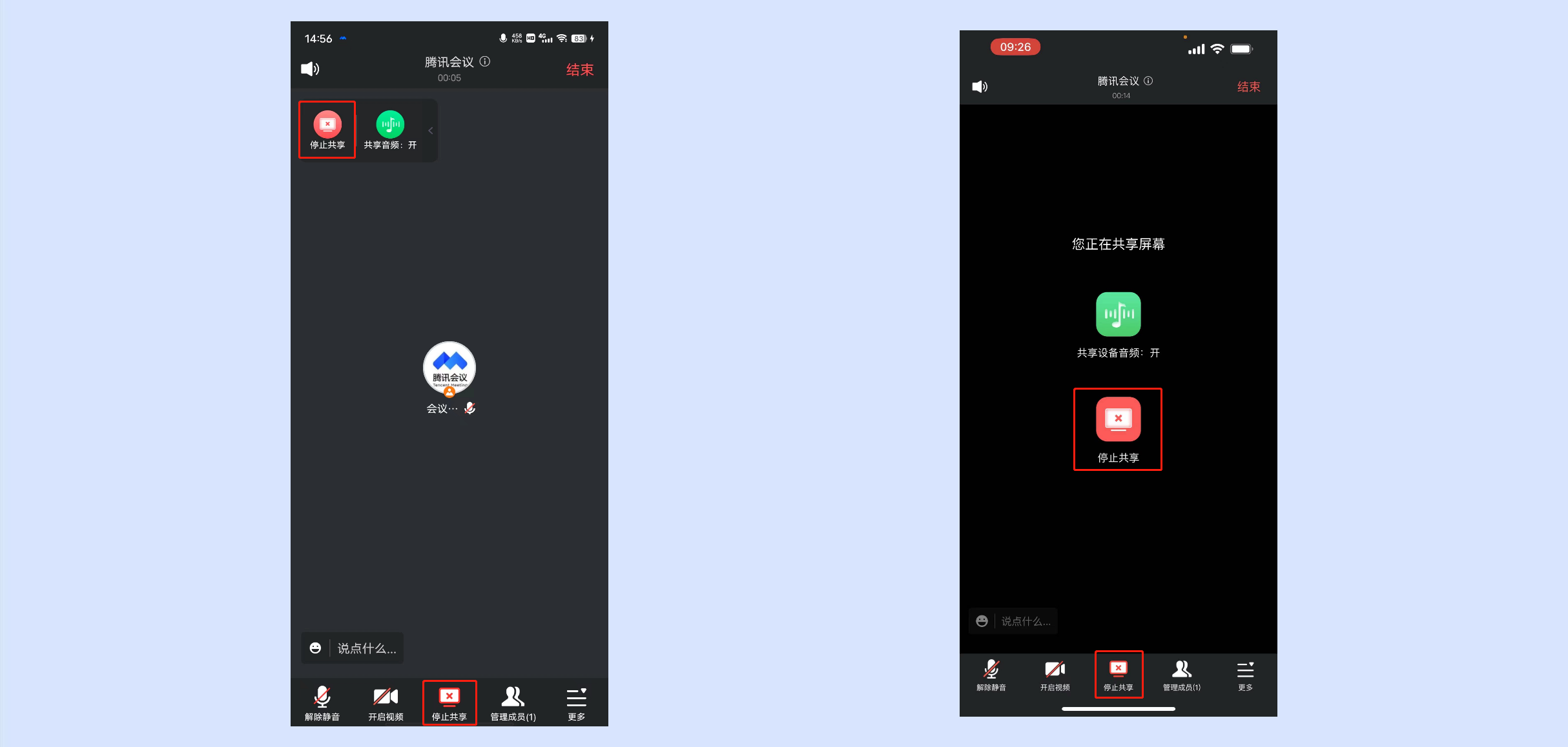 屏幕共享状态下,点击【停止共享】/【停止直播】按钮,即可结束并退出共享状态。