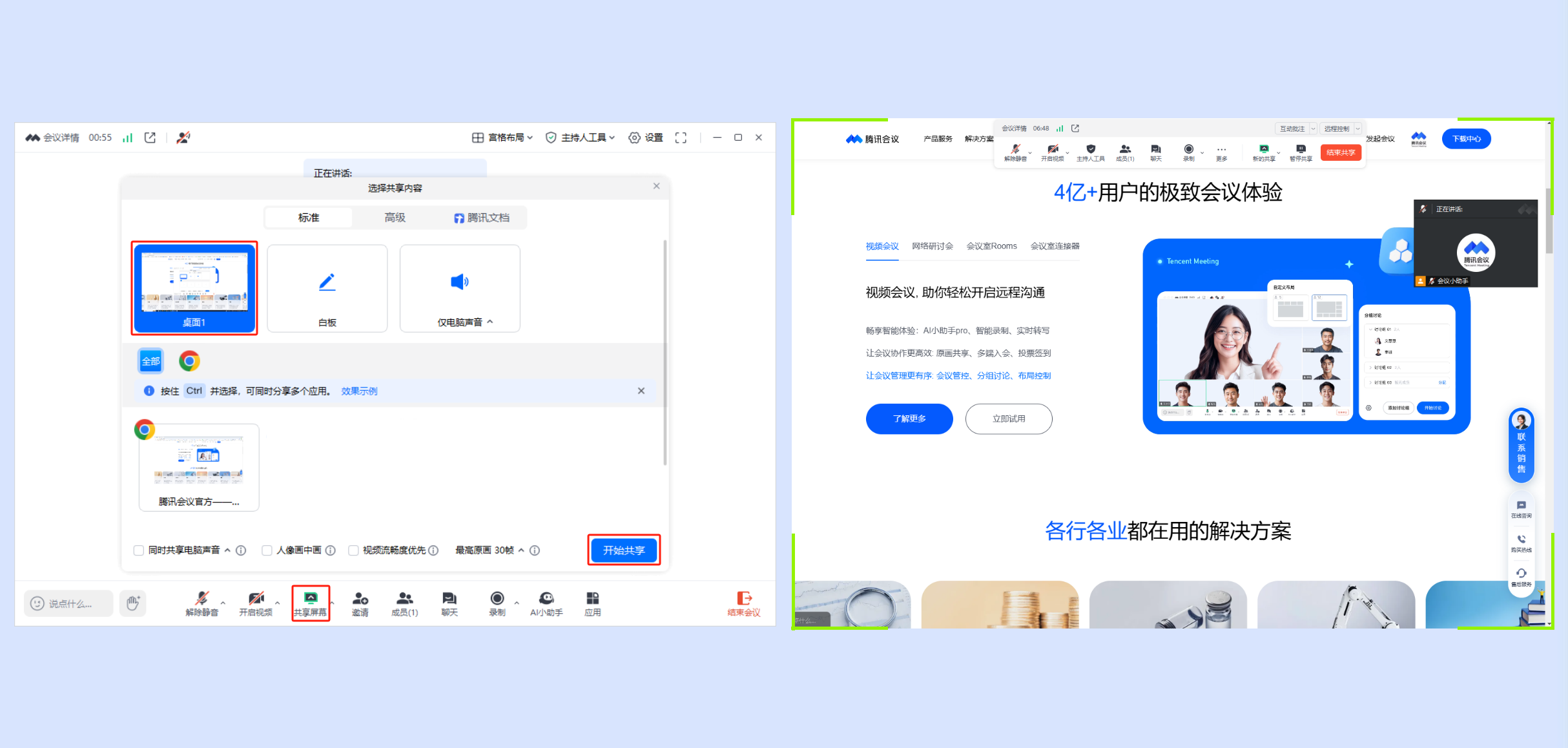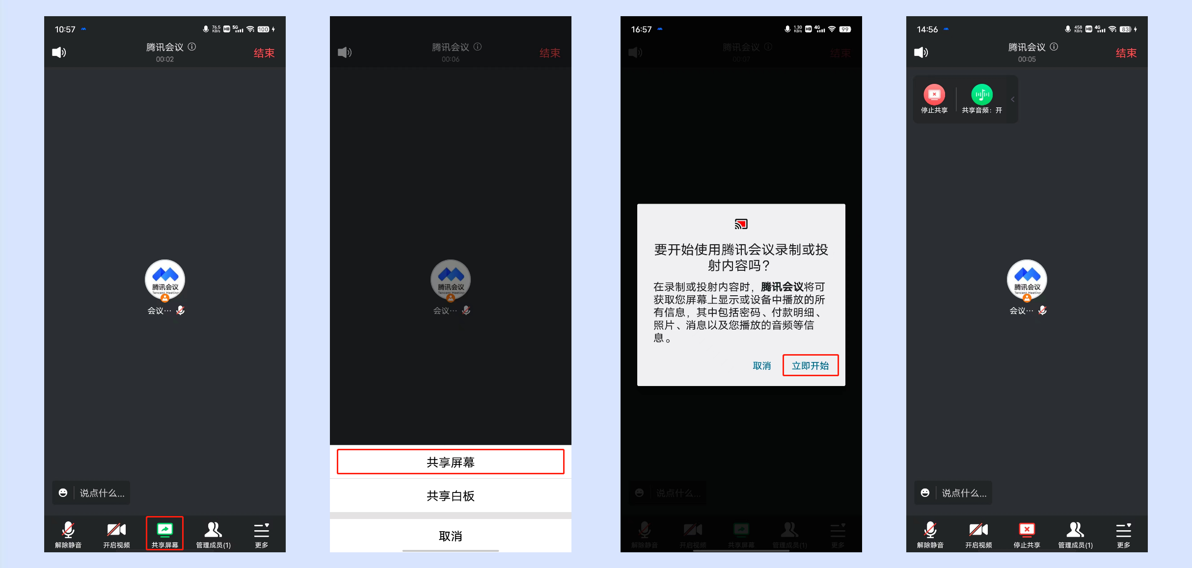 ①会中点击底部工具栏【共享屏幕】->选择共享内容,并点击【开始共享】,即可开启屏幕共享。