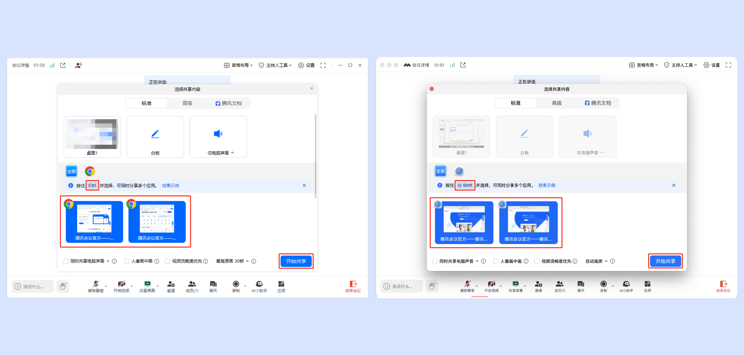 3.30及以上版本支持同时选择多个应用窗口进行共享。