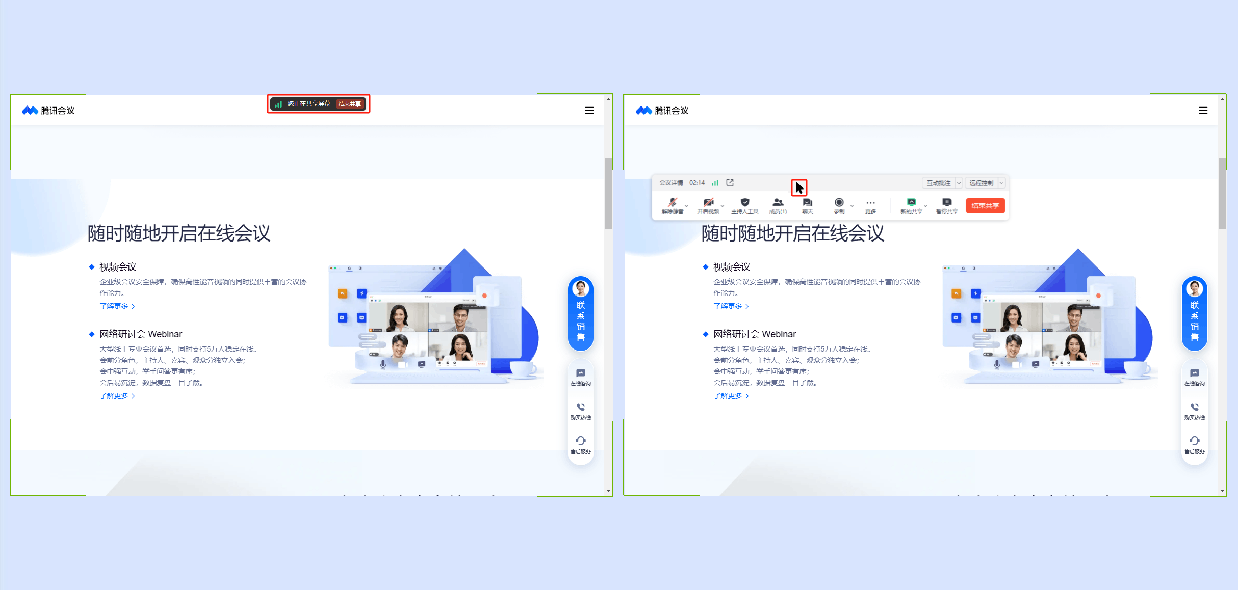 3.28及以上版本桌面端共享屏幕支持排队,第二位共享者可以提前进入共享准备状态,待前一位共享者结束后,所有参会人将观看其屏幕。