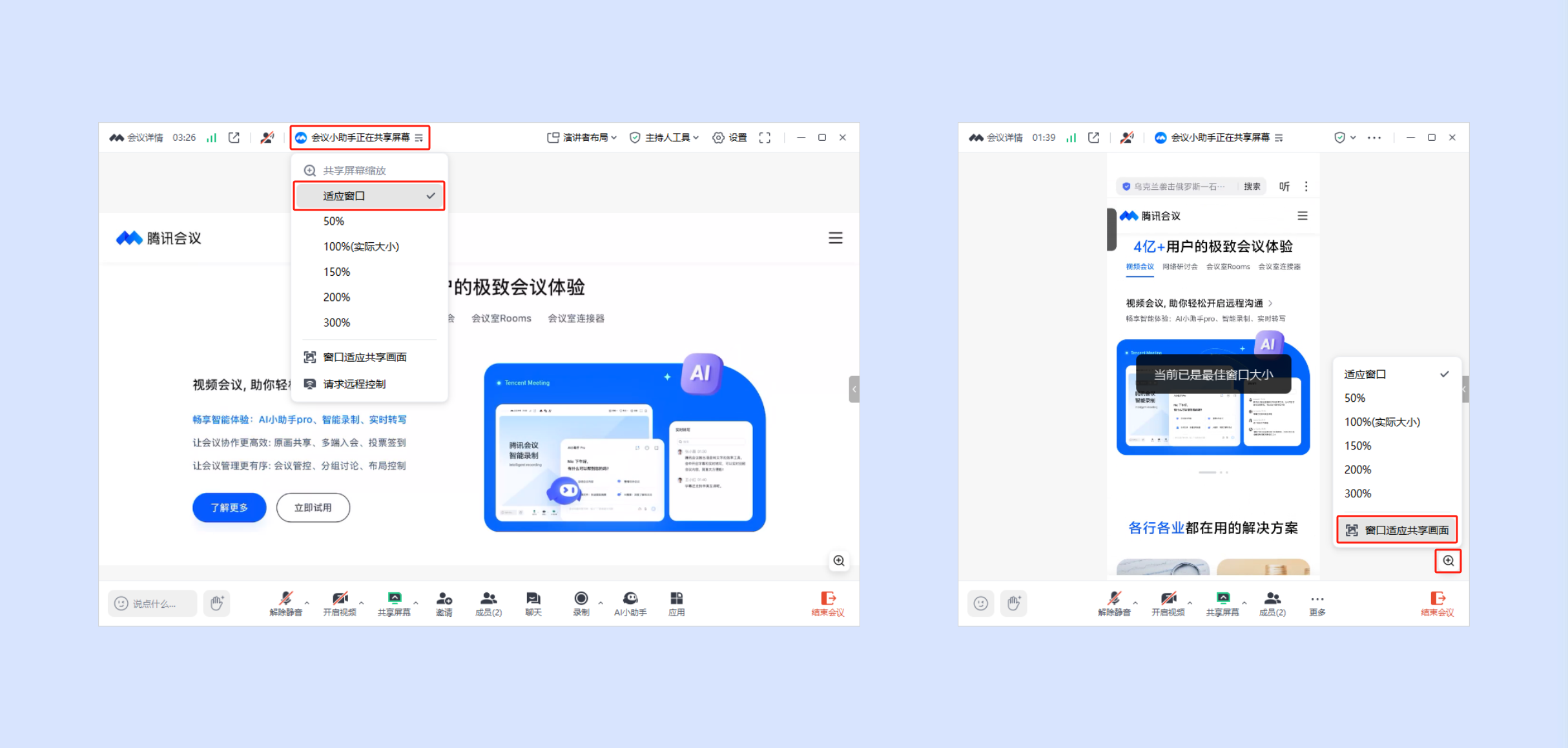 3.31及以上版本支持观看共享屏幕时窗口适应共享画面,设置后窗口将自动适应共享画面的尺寸;可点击画面右下角“缩放”按钮->【窗口适应共享画面】,设置后窗口将自动适应共享画面的尺寸。