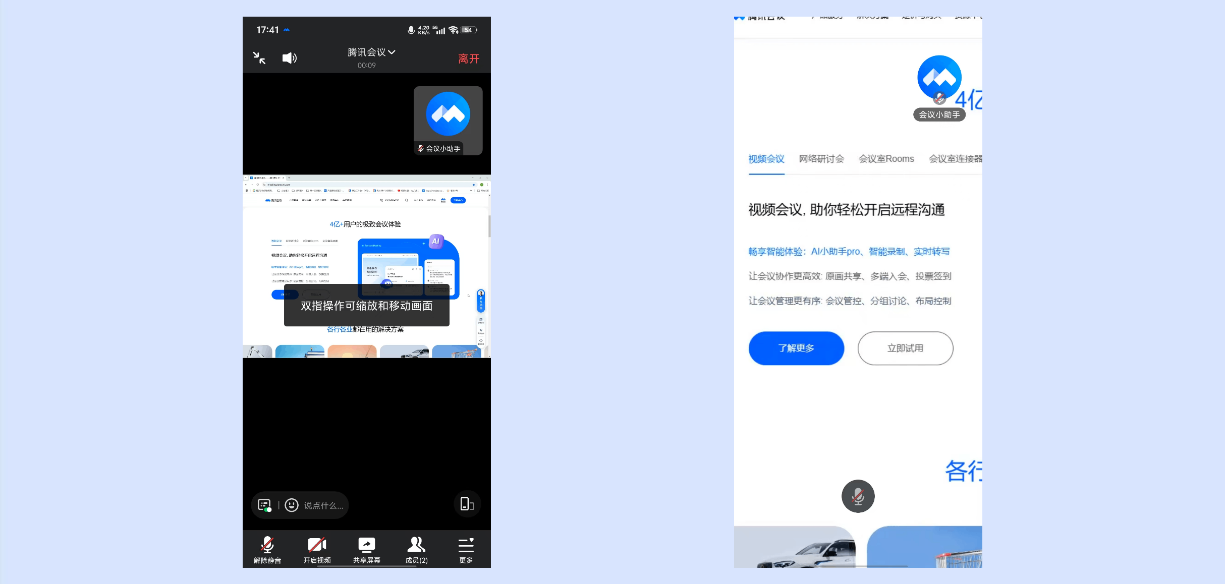 观看共享屏幕时,可通过双指操作来缩放和移动画面。