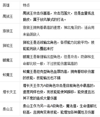 同样,在BOSS英雄角色中,泰山王,增长天王,蛟魔王和狮驼王比较容易上手操作,输出也都不错,而禺狨王,猕猴王和鹏魔王对于操作的要求比较高,可能需要精深一点才能操作得好。