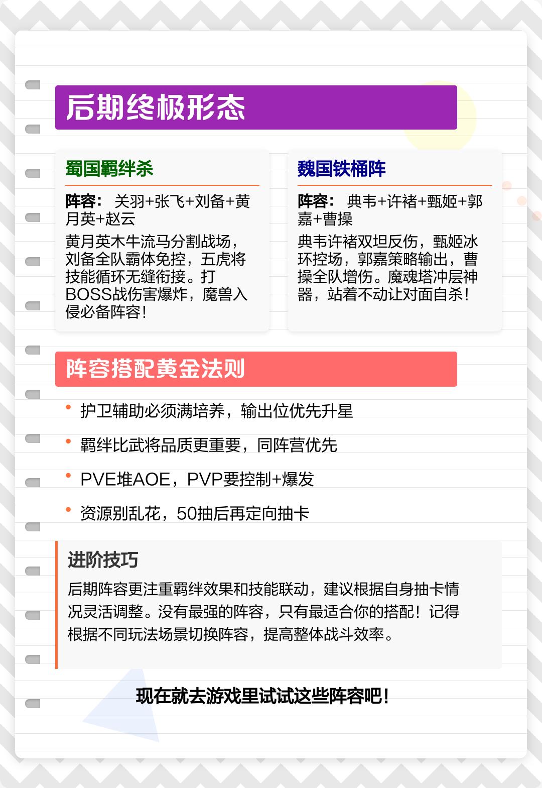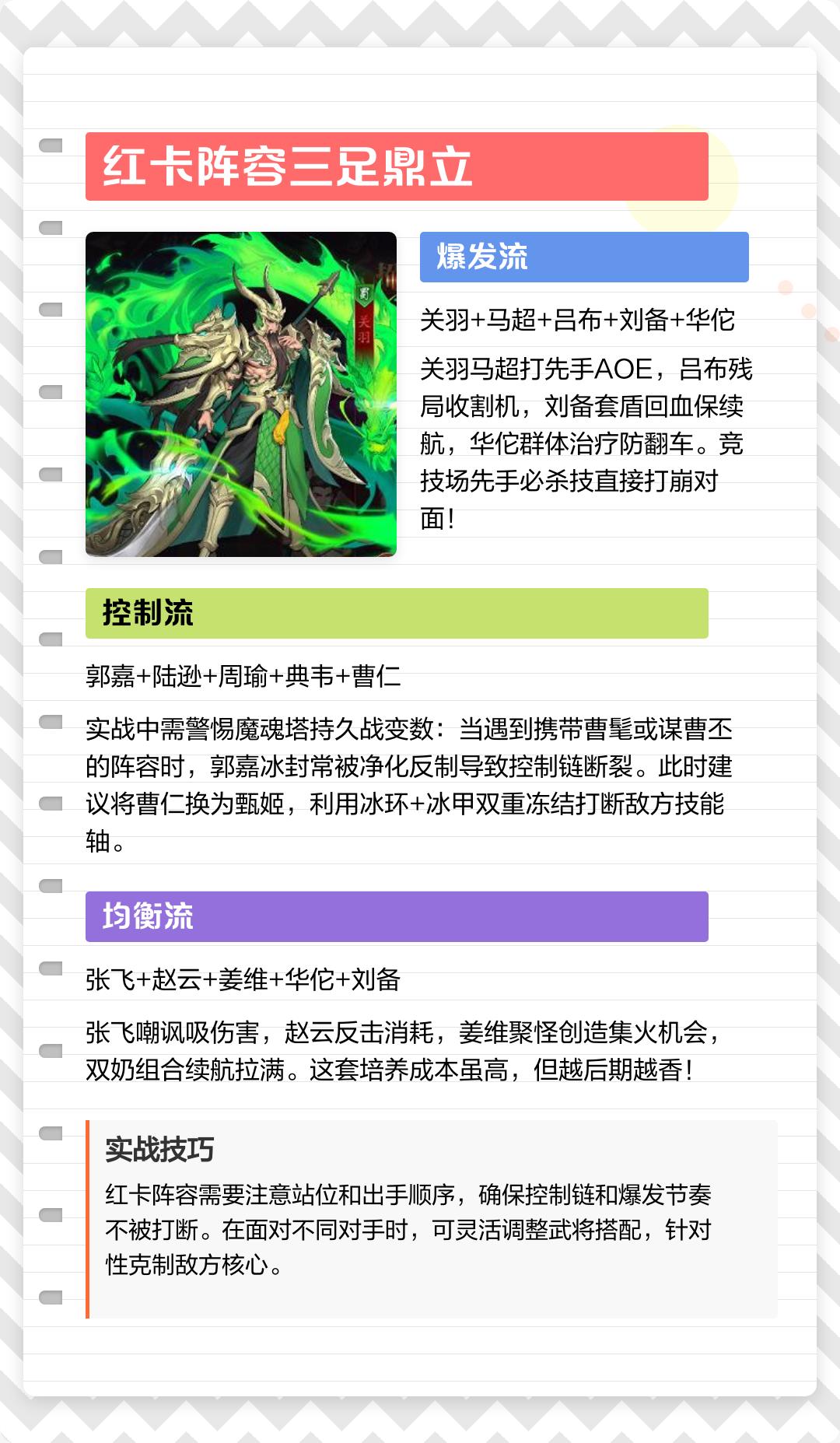爆发流:关羽+马超+吕布+刘备+华佗。先手AOE+残局收割,双治疗保续航,竞技场速攻首选。