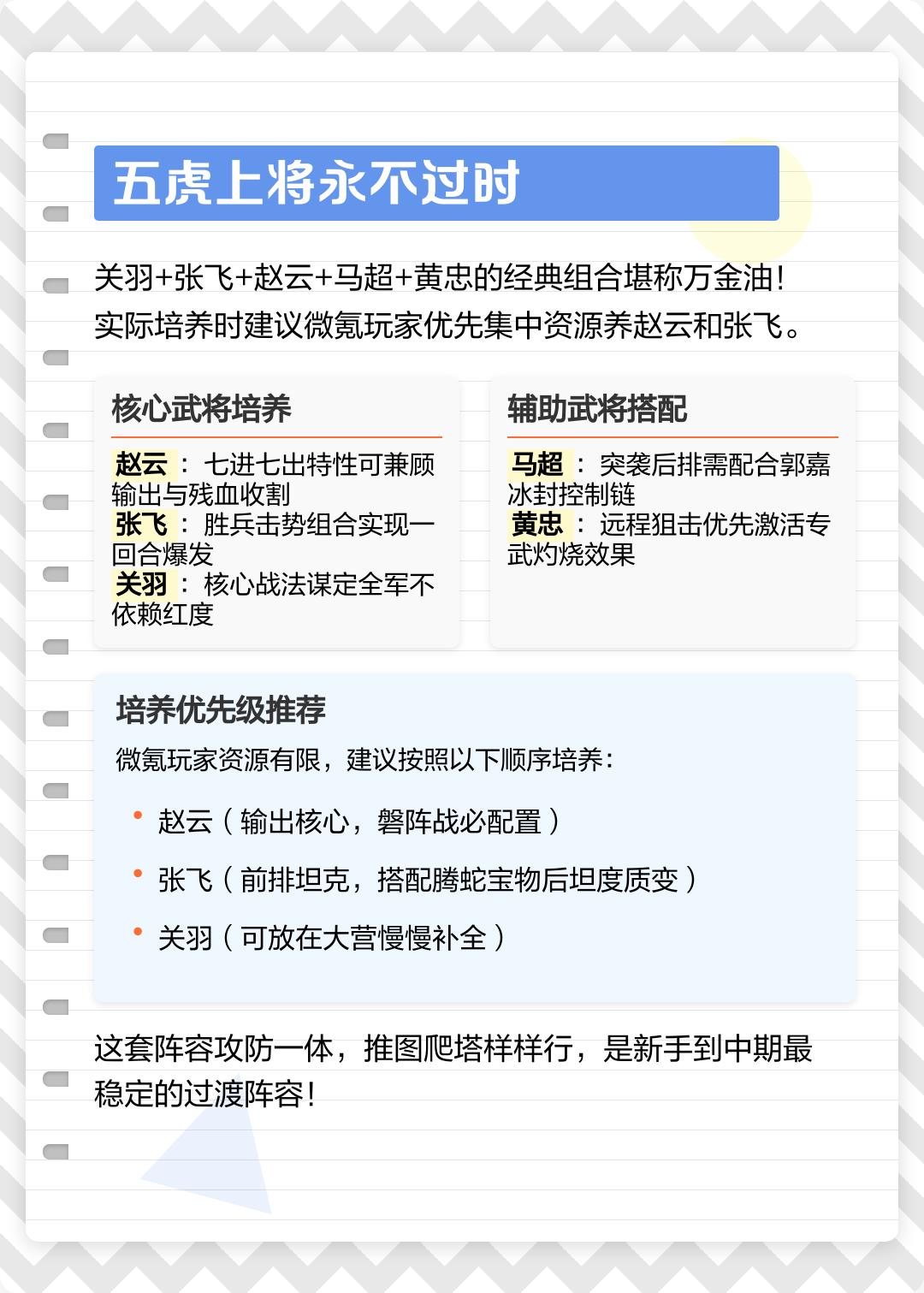 核心组合:关羽+张飞+赵云+马超+黄忠。微氪优先养赵云(七进七出+磐阵战必)和张飞(胜兵击势+腾蛇宝物),关羽补全谋定全军战法。马超需配郭嘉控制链,黄忠激活专武灼烧。推图爬塔全能,培养顺序赵云→张飞→关羽。