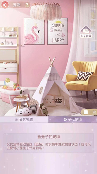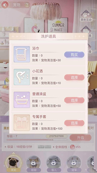 2.照顾宠物需要注意四个方面:清洁度、可爱值、宠物的心情还有最重要饥饿度。每个方面都有对应的道具,可以通过系统赠送获得也可以直接用金钱购买,不同道具的加成不一样,价格也各不相同。