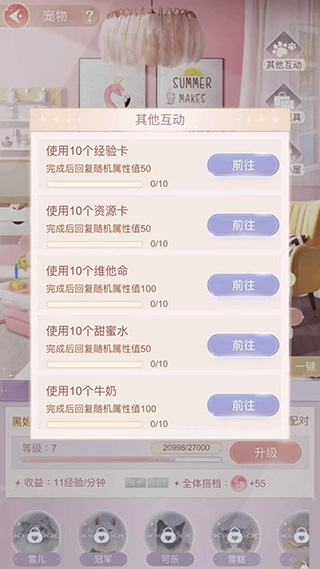 5.基本上照顾宠物还是不需要花费太大心思的,时不时去看看它需不需要投喂就好了,经验一满就点升级。有钱的玩家当然可以购买各种道具跟宠物进行互动,这样宠物成长得更快。但白飘党们也不要气馁,攒点钱买食丸就可以了,小可爱照样可以健康长大。