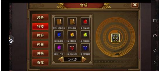 点击合成界面会出现如图界面,一阶合二阶装备或者辅助选第一个装备,第二个前面的一般需要花钱直接略过最后的这些提升攻击等的合成也是在特技里不要忘了找不到。