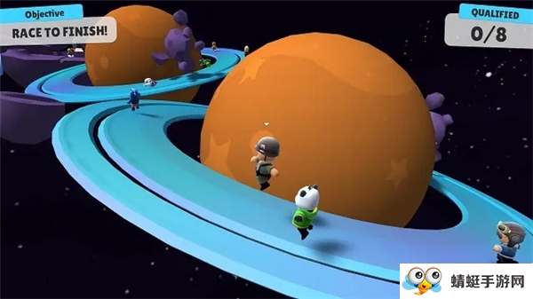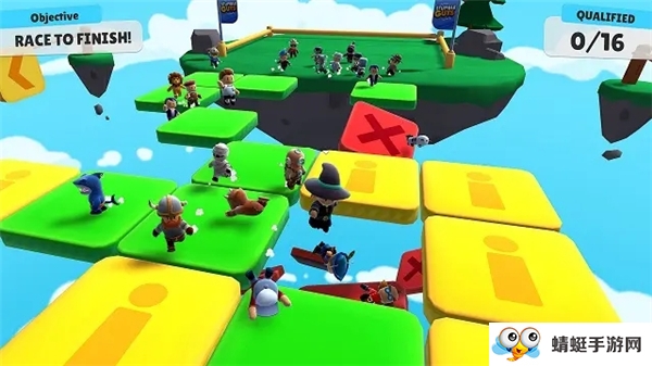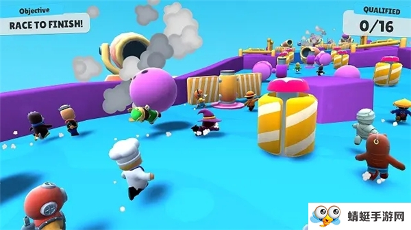 2.五彩扎眼的画面颜色,一群Q萌的卡通小人在各种花里胡哨的地图赛道上你追我赶的搞笑场面,乍一看和《糖豆人》不能说完全一样,只能说一模一样!
