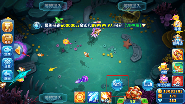 3、点击下方图示位置自动,可以自动捕鱼,解放双手,点击加号可以进行炮台选择;