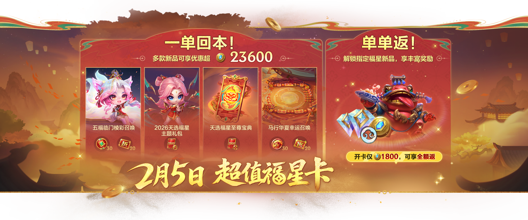 【天选福星】将于2月5日正式开启,熟悉的福星节奏与爽快体验再度归来。福星守护神登场,新春使者降临,3星5费弈子对局表现华丽升级!更有【团队排位】模式上线,与好友组队在热闹氛围中并肩冲分,一起上分一起赢!