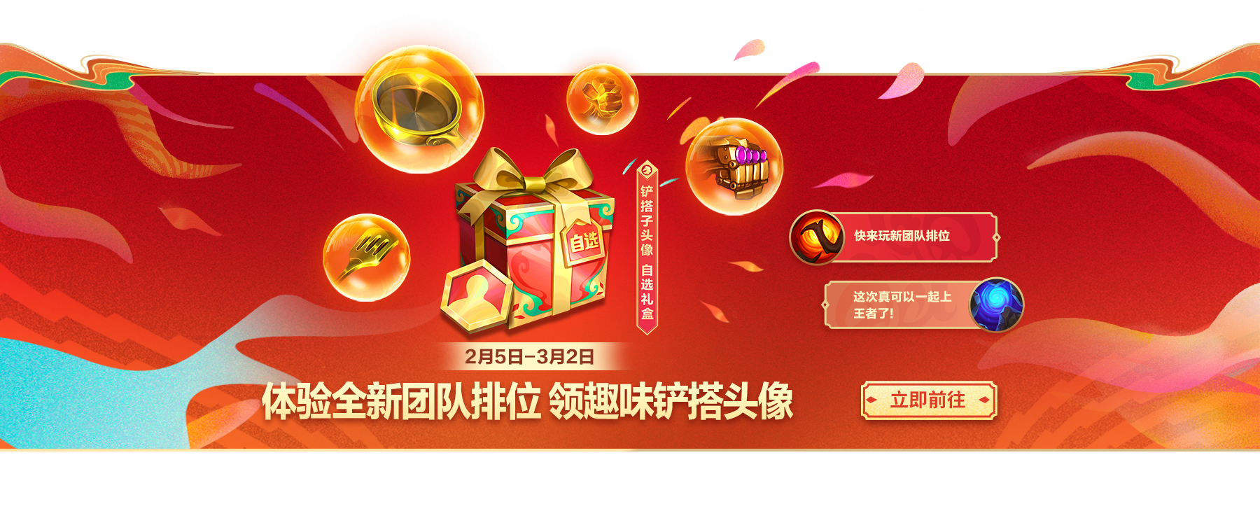 【团队排位 开铲有礼】2月5日起,全新模式玩法【团队排位】上线,参与活动即可领取“铲搭子头像自选礼盒”和定制涂鸦“今天也想和你排位”!