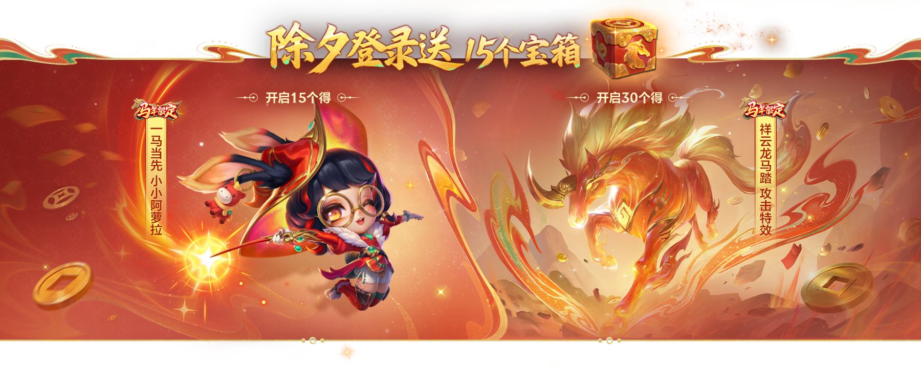 【"马"上开宝箱】2月5日起,完成指定对局获得“福运宝箱”,累计开启宝箱免费解锁马年限定奖励:“祥云龙马踏 攻击特效”、“一马当先 小小阿萝拉”、“一马当先 羽饰骑士(1星)”等精美好礼!