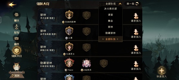 ○通过点击社交框→组队大厅可快速寻找对应项目的组队。