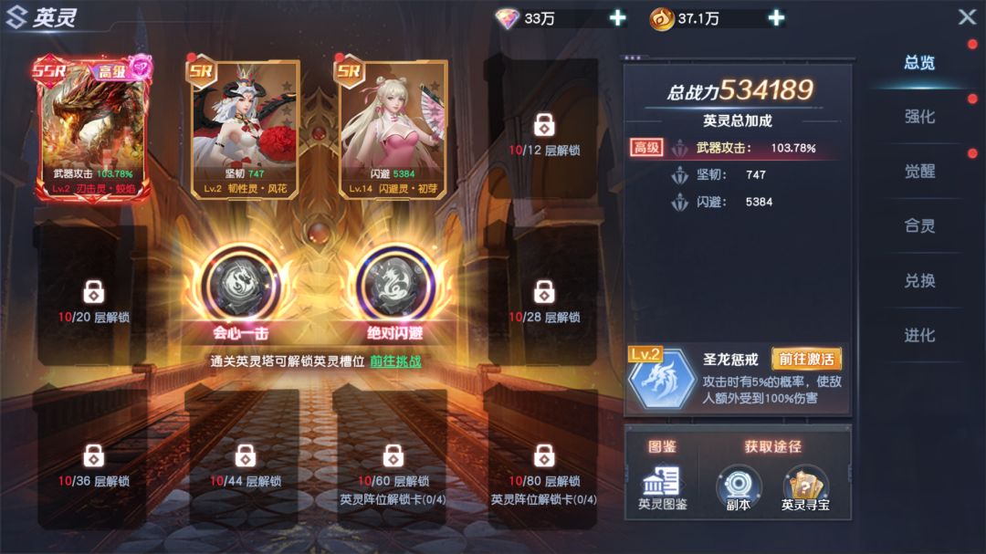 英灵是游戏内十分重要的一个系统,品质由低到高依次为:R/SR/SSR/UR/SP,越高品质的英灵提供的属性加成越高,并带来高额的战力提升。英灵的获得方式主要为英灵回廊副本,通过挑战英灵回廊,不仅可以获得大量的英灵,还可以解锁英灵位置,同时上阵更多的英灵。此外,还可以通过英灵寻宝快速获得高品质的英灵,飞速提升战力。