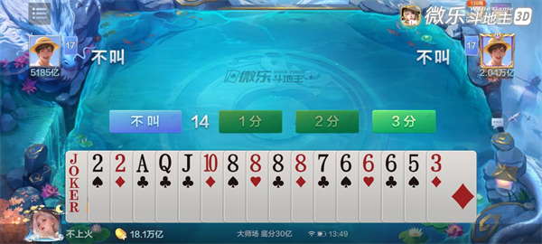 3.发完牌后,需要叫分,如果是由你开始叫,你可以选择1分、2分、3分或不叫,叫3分成为地主,无人叫3分时最高叫分者为地主,一轮结束后无人叫分重新发牌,成为地主可获得剩余底牌,并且第一个出牌