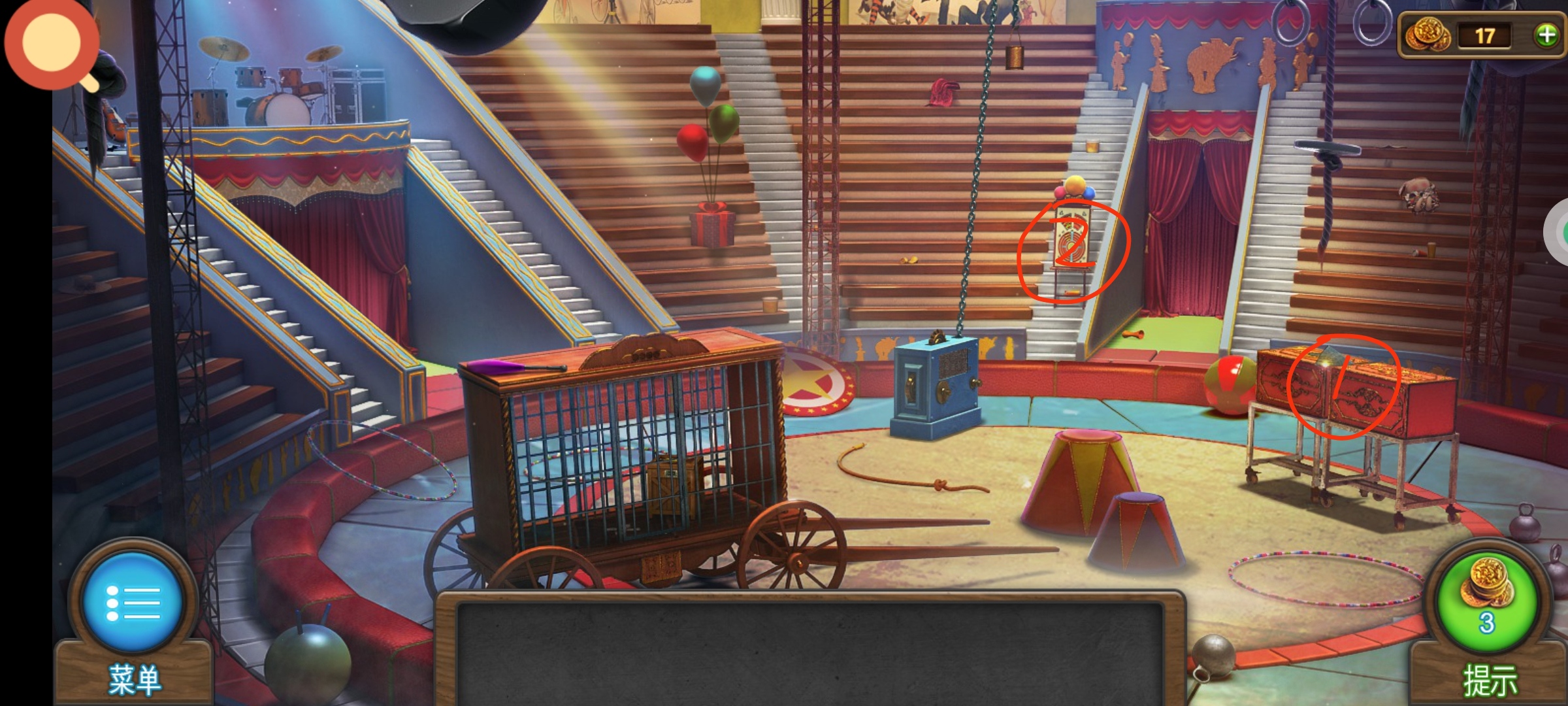 进入道具库,红圈处使用胡萝卜,兔子走后点击帽子,获得道具:①钥匙,②筹码1。