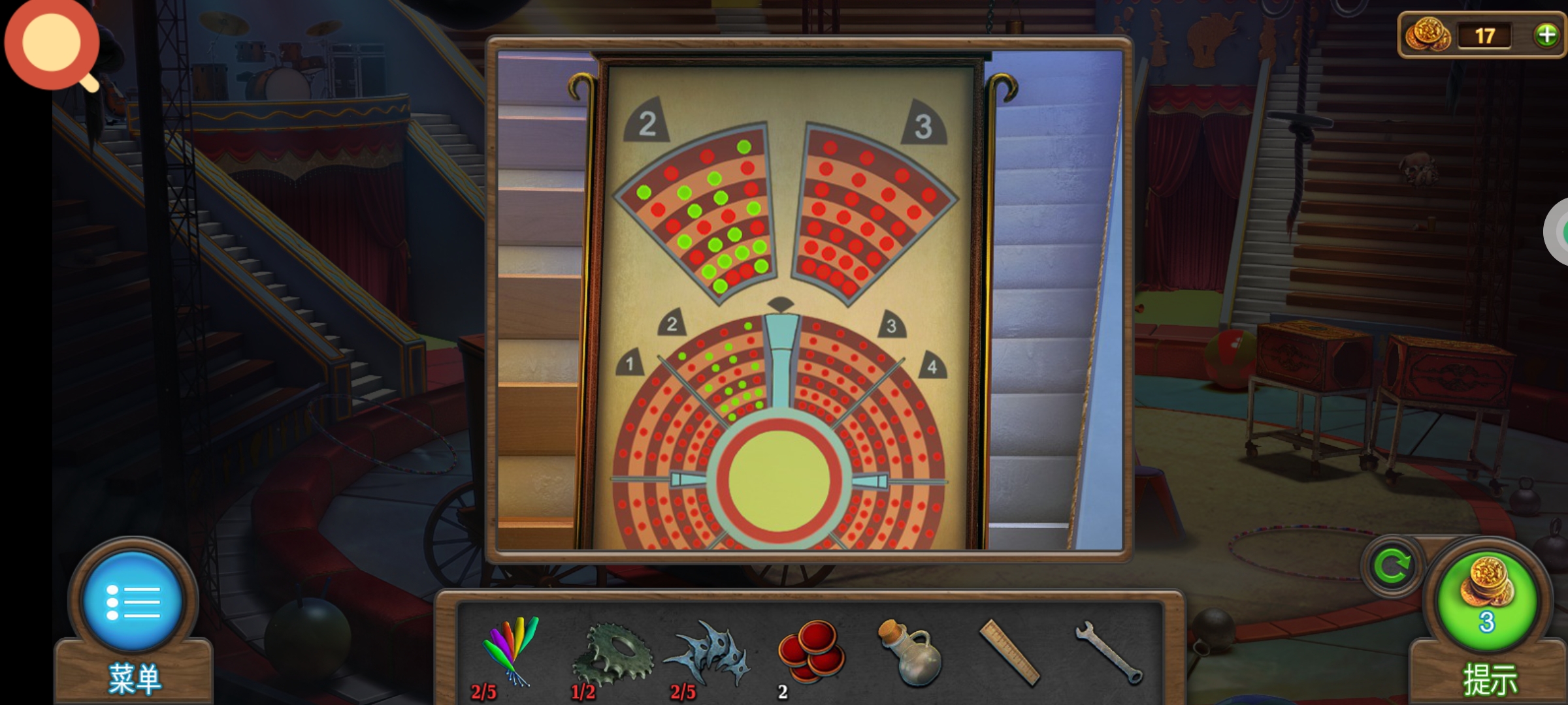 厨房红圈1处使用代币,根据红圈2的苹果提示,顺序为:红红绿绿红红红绿,获得道具:大象代币。