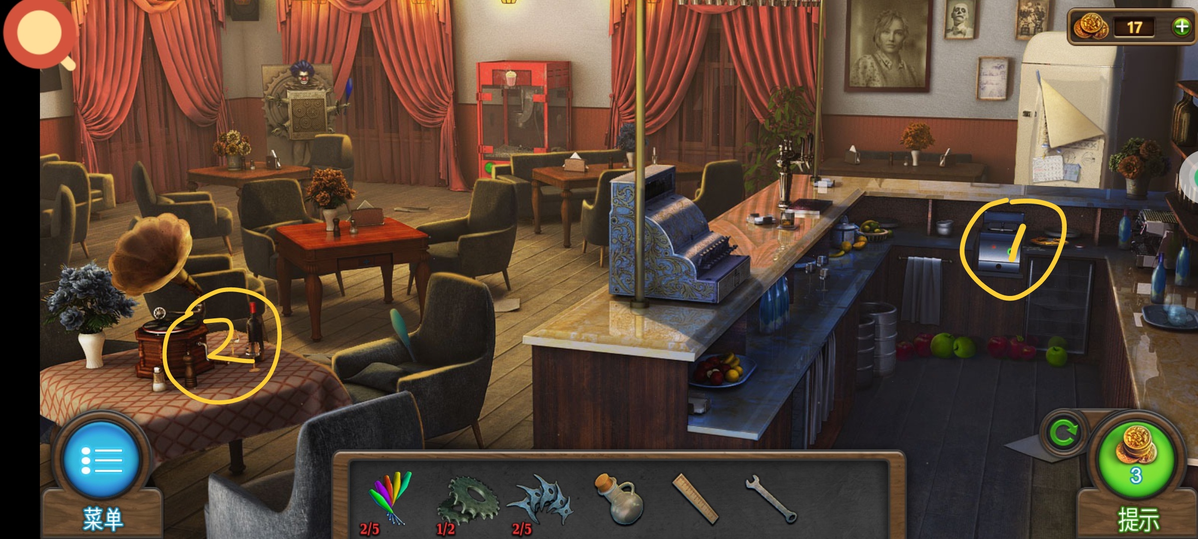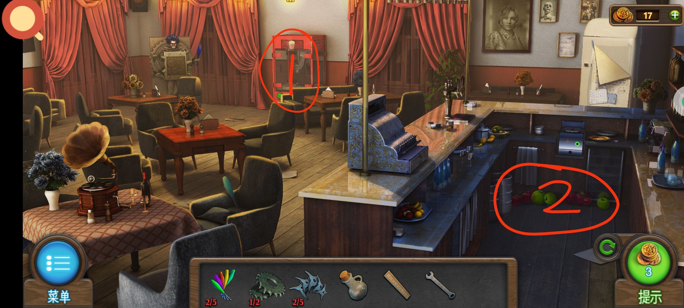 进入厨房,❶红圈处使用钥匙,完成小游戏后获得代币。❷接着使用尺子获得筹码2。