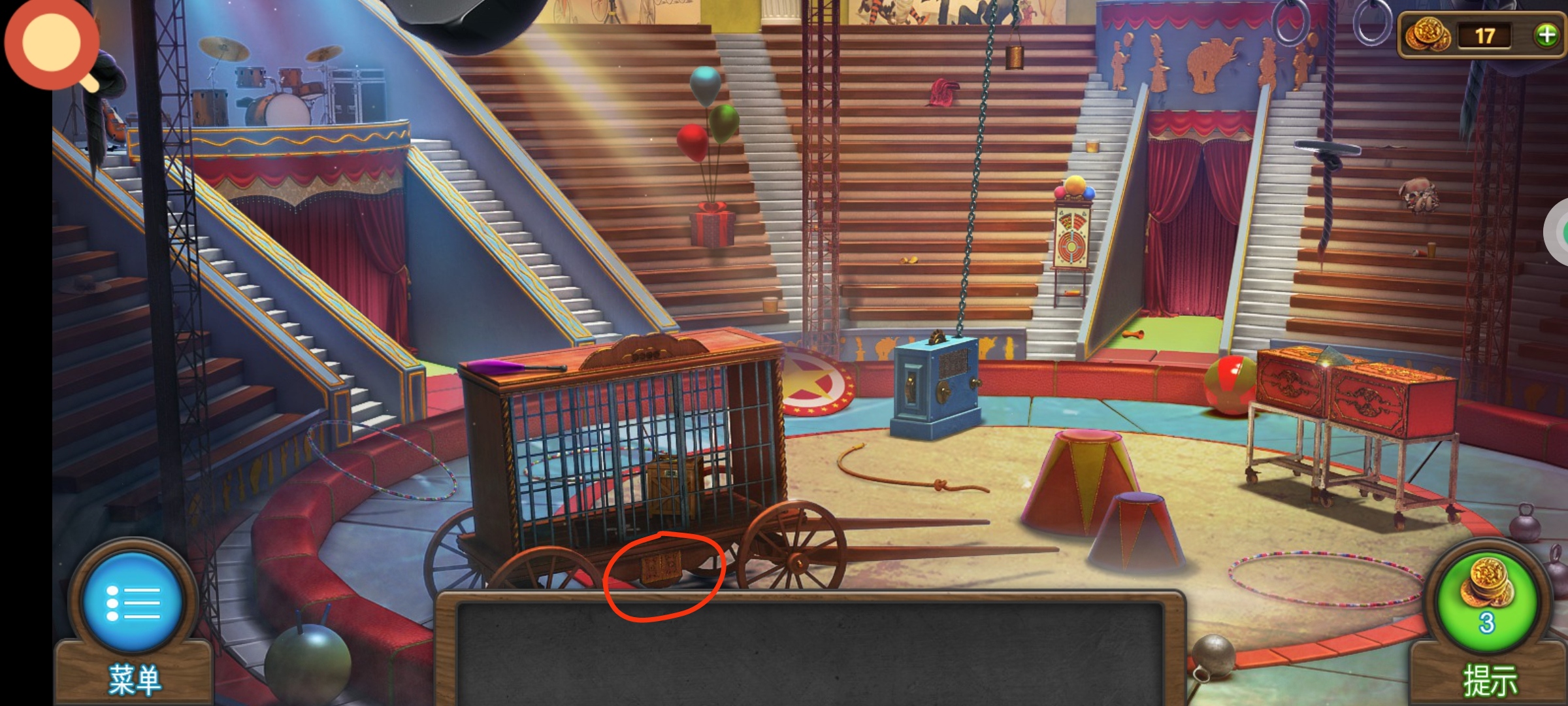 返回主场景,红圈处使用老虎代币和大象代币,完成小游戏后,上面的箱子锁会打开,点击获得道具:棍子5。然后要求输入一个6位数密码。