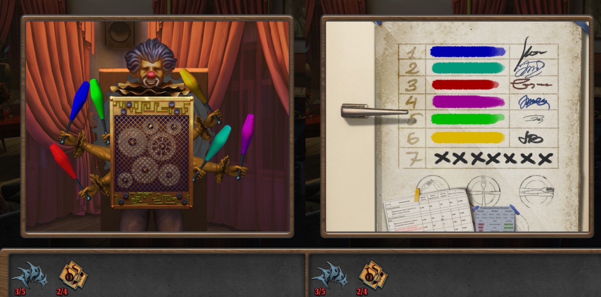 返回厨房,红圈处使用棍子,小丑丢完后棍子后,棍子会按照一定的顺序排列,根据冰箱上的颜色提示,从左到右的顺序排列数字,就是刚刚箱子的6位数密码。(颜色顺序可能会不一样)打开获得道具:浮雕品。