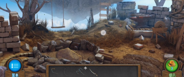 87、将【手柄】安装在右边的磨盘上,使用【生锈的刀】获得【刀子】,并拾取磨盘旁边的【钢丝】和【枷锁】。