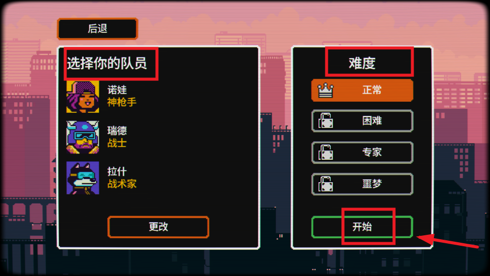 2.进入后,选择你的队员,游戏难度,点击开始