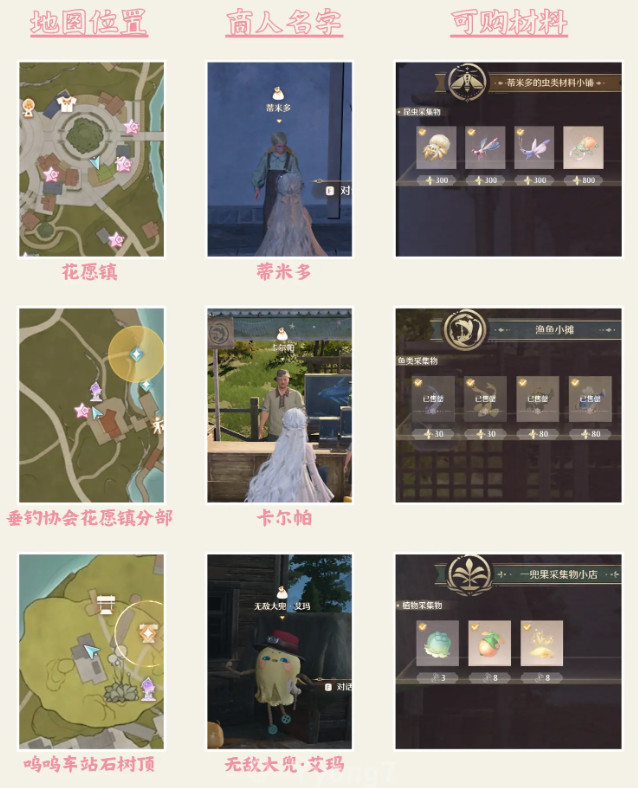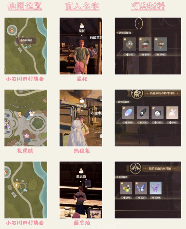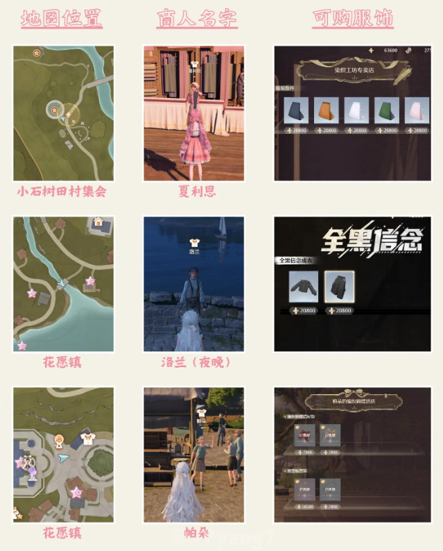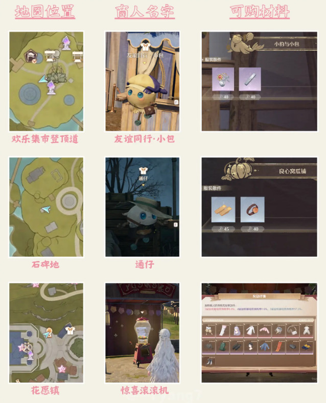 每个地图都有一些服装商人出现(有些有特定时间要求),可以用噗灵(金币)买一些散件,我很喜欢的紫色毛衣也是在服装商人手里买的