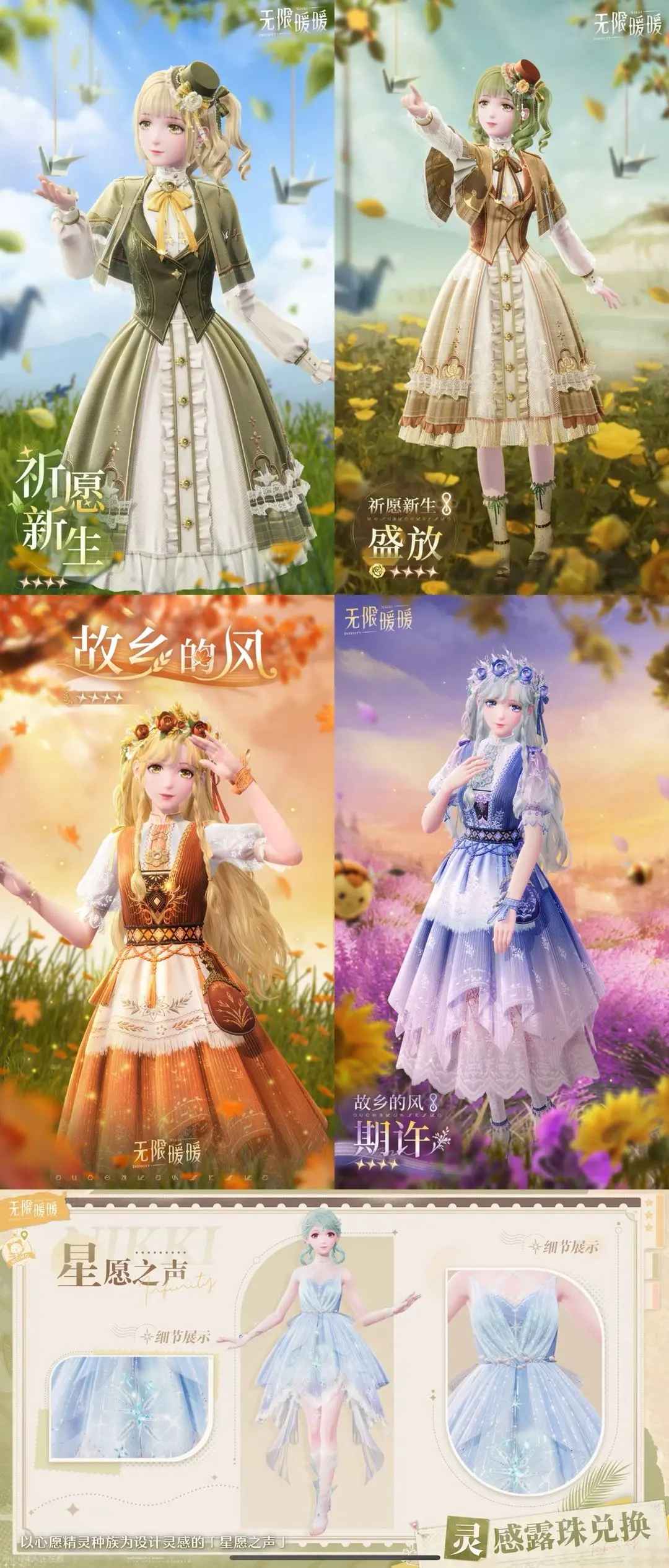 在大地图收集灵感露珠后,找蓝龙兑换,付费测时有两套,加上上次公测前瞻公布的,目前一共知道三套(应该都是四星),真的都很好看