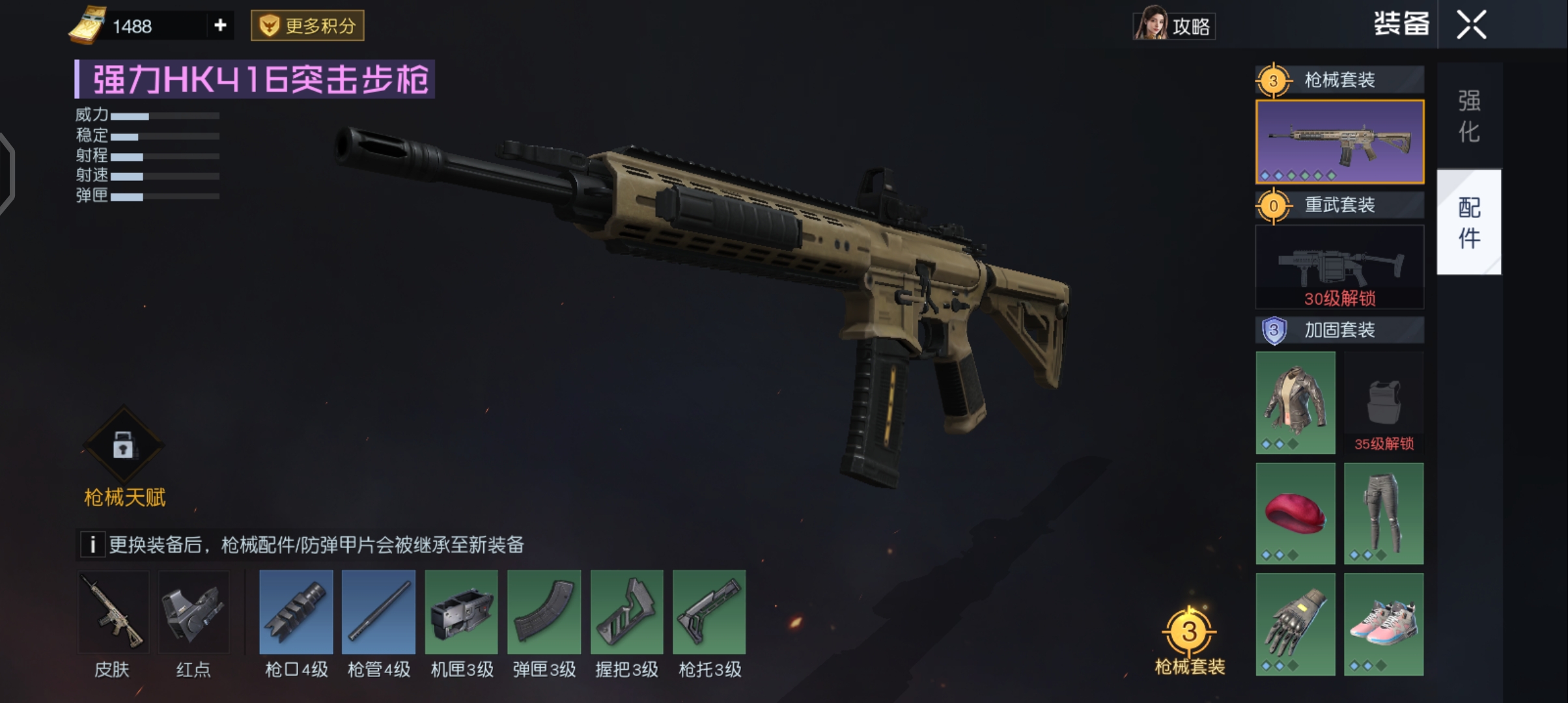 建议我们强化均衡发展强化是直接影响六维数据比如生命 伤害 护甲等强化材料送的很多只要你日常任务做满,强化材料都是足够你使用的,虽然不能够像氪金玩家那样,解锁新等级,直接强化到等级上限,但是解锁到下一个等级强化前都是可以强化满的,只是花费的时间稍微长一点,配件有套装属性加成,无论单独的配件等级多高效果都是没有套装效果明显的,一定要尽可能的激活套装效果,主武器是枪械套装 主武器装配六个同等级的配件,可以激活枪械套装效果,重武器是重武套装,重武器装备四个同等级的配件就可以激活重武器套装效果 装备是加固套装 防具安装六个同等级不同部位的加固板,可以激活加固套装 打磨和强化带来的效果是差不多的,但是打磨系统的武器栏是单独给武器,重武器,近战武器增加基础伤害的,不过七件装备打磨到相同的等级是可以激活打磨套装的,但是可以打磨的装备是九键,不建议打磨近战武器近战武器使用场景较少,加上打磨时比较缺陷,没有必要打磨近战武器 尽可能打磨七件同等级装备,激活装备打磨套装属性,改造和特技是比较消耗资源的,加上改造和特技系统比较复杂,本教学不打算进行讨论,可以暂时不考虑改造和打磨反正大家记住一句话,一定要激活套装效果!