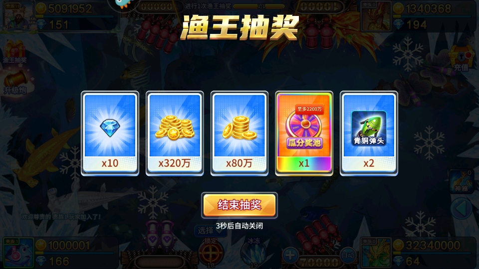 2、捕到的鱼会根据其价值给予相应的金币或奖励,玩家可以使用获得的钻石来解锁更高倍率的炮。