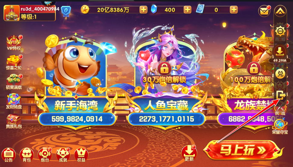 1.打开捕鱼大世界,进入游戏,点击右上角的小箭头