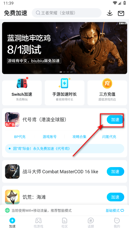 1.首先我们需要使用加速器才能玩这款游戏,小编这里使用的是biubiu加速器,进入加速器首页,找到代号鸢点击加速。