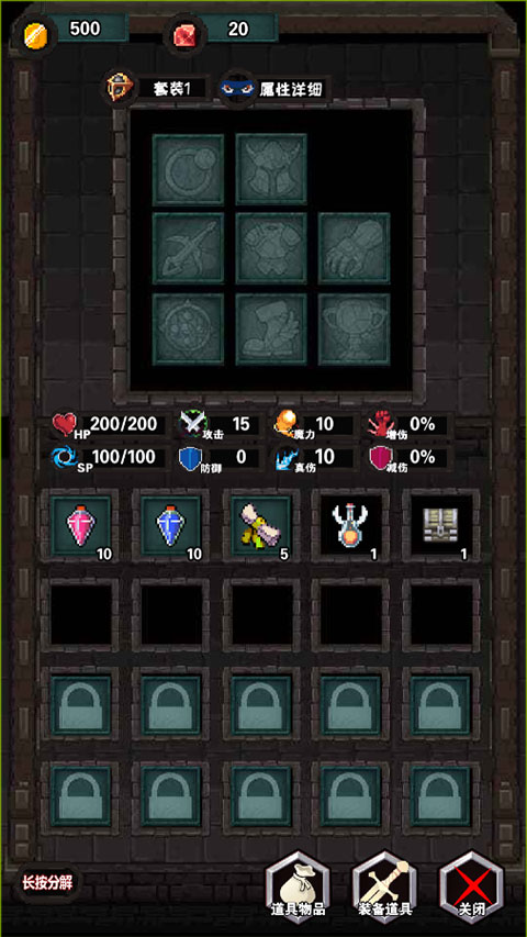 2.在装备道具中,可以查看我们拥有的道具武器的属性,也能够分解合成其他物品;