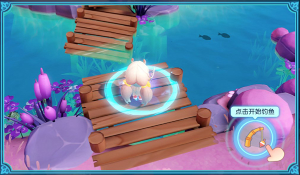 1、在水域中看到鱼影可以前往附近钓鱼,出现钓鱼标记后点击右侧鱼竿,开始钓鱼。