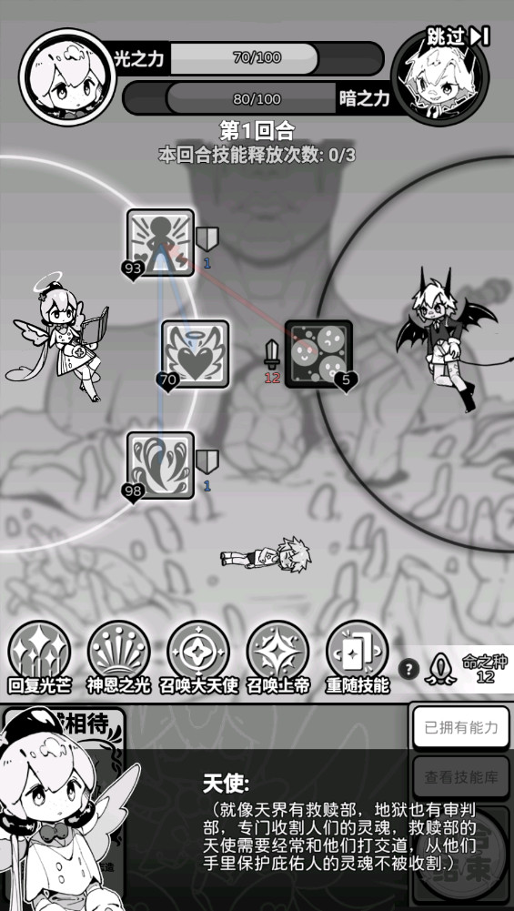 天使的技能会以卡牌的形式呈现,从功能上分为计谋:单体攻击,撒娇:群体攻击,庇护:提供防护。使用技能需要消耗光之力,并且每回合使用的技能次数有限,所以每回合使用什么技能需要仔细斟酌。