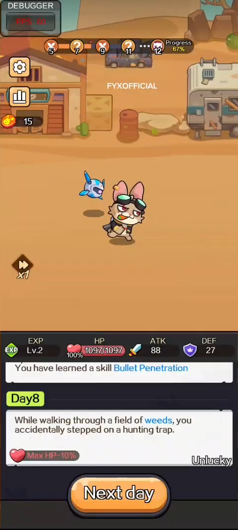 末日兔子是一款结合萌系元素与硬核生存挑战的策略性游戏,玩家将控制一只勇敢的兔子,在一个充满丧尸的末日世界中生存下去。虽然兔子外表可爱,但游戏的生存模式却充满挑战和紧张气氛。你需要在这个资源匮乏的废土上,管理背包中的物资,合理安排食物、弹药和工具的使用,确保每一步决策都能帮助你在这片危险的世界中存活。
