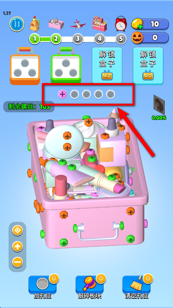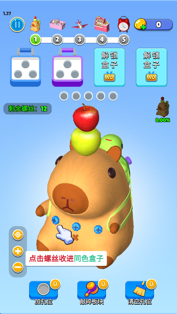 1.打开关卡后,你需要的就是点击上面的螺丝与你的放置盒子颜色相同。
