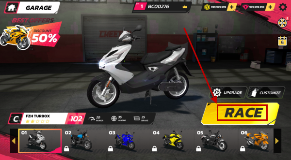 1.下载好游戏后,点击进入到游戏中,接着点击屏幕右下角的RACE开始比赛。