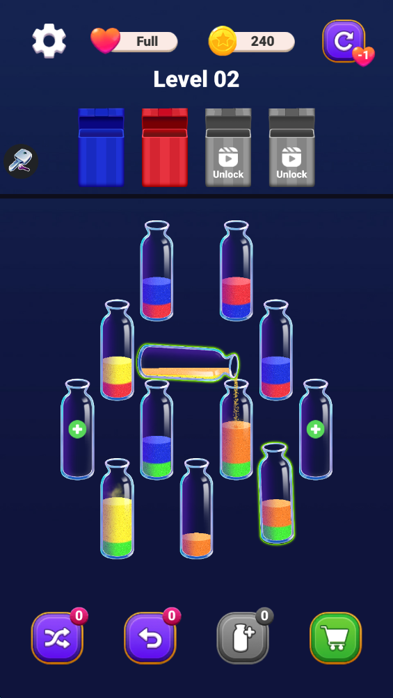 彩沙分类挑战是一款充满创意与趣味的3D逻辑解谜游戏,玩家将在游戏中通过灵活的思维与精准的操作,将五彩斑斓的沙子分配到不同的瓶子里。每个瓶子都只能容纳一种颜色的沙子,玩家需要通过简单的敲击或拖动操作,将沙子逐步分类,确保没有混淆。伴随流动沙子的声音,还有轻柔的背景音乐,营造出一种平和与放松的氛围,使得整个解谜过程充满了宁静感。
