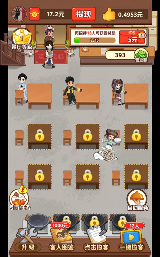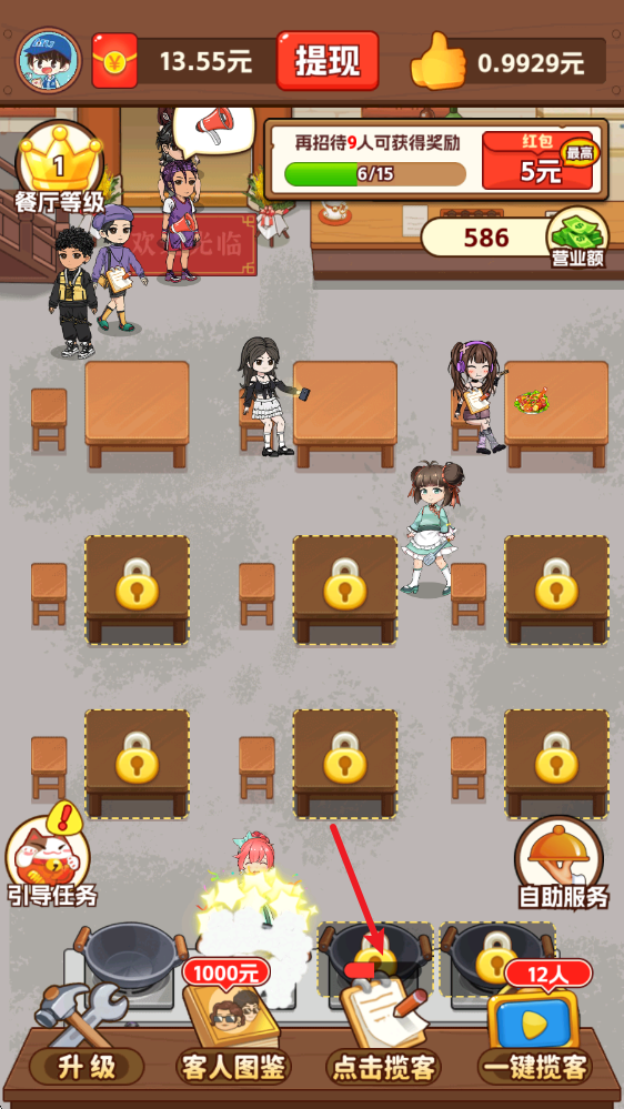 1.进入游戏后,点击右下角的揽客即可吸引客人前来用餐。