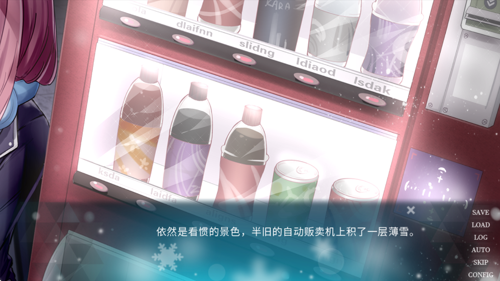 4.进入剧情界面后,右侧有 “SAVE(存档)”“LOAD(读档)”“LOG(日志)”“AUTO(自动播放)”“SKIP(跳过)”“CONFIG(设置)” 功能按钮。