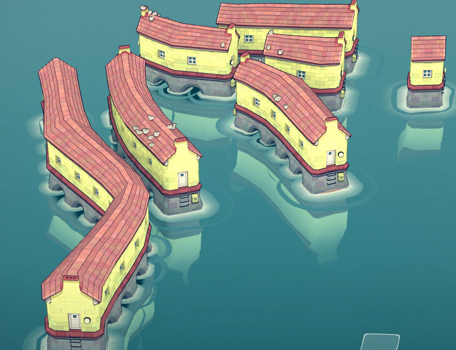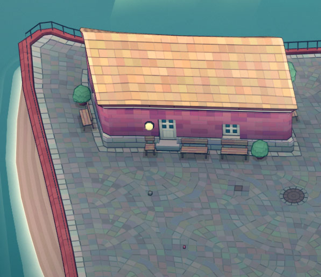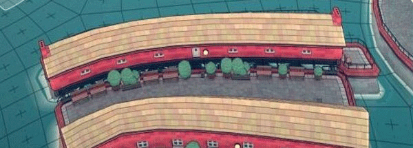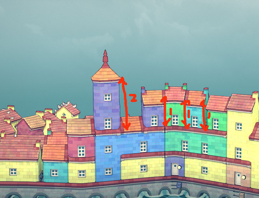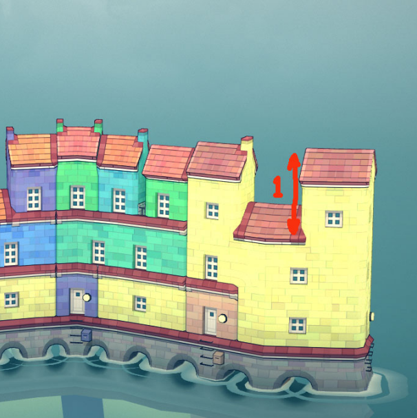 不同颜色建筑物之间可能会出现间隙,多个不同颜色建筑物间会随着数量增加随机生成墙边填补间隙(图1)。当不同颜色建筑背靠区别于他们颜色的高墙时,会生成墙边填补所有建筑间隙(图2)