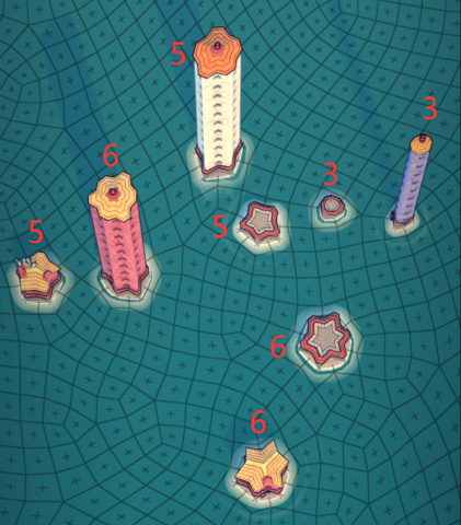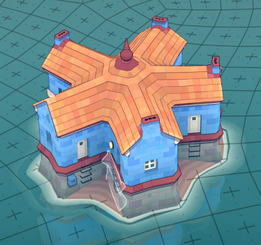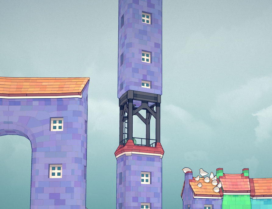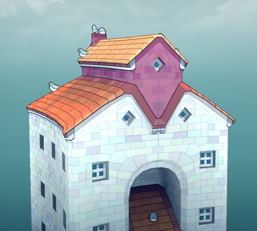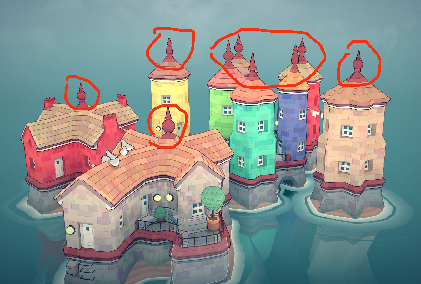 大多数情况,一般尖顶会出现在尖塔上;但可以通过使用相同颜色将建筑块相交成星形或十字形来使地基上一层建筑生成尖顶。